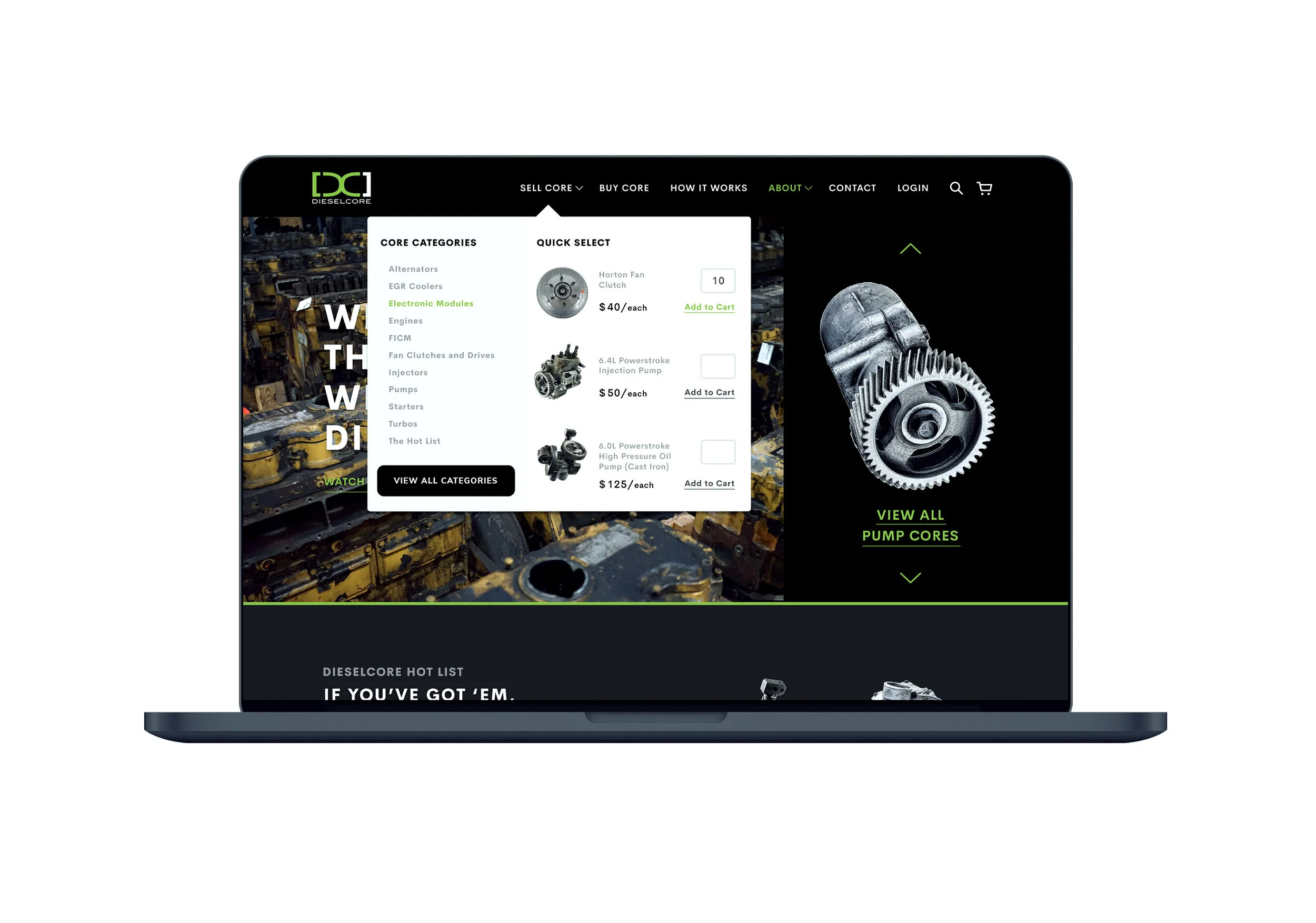 This web project was unique in its approach as the site allowed users to sell specific items to DieselCore, reversing the roles of the buyer and seller on a standard e-commerce site. Working closely with the client, I went through user personas and identified the different pain points of the existing site. Our objective was to create an automated selling process that is simple and pleasant.